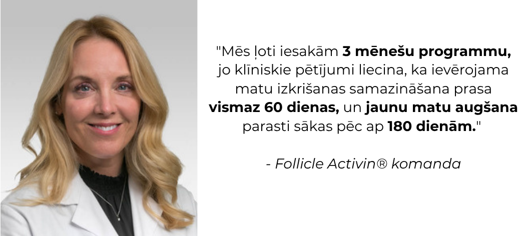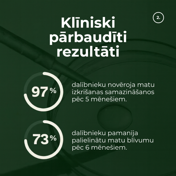 - Līdz 60% matu izkrišanas samazinājumu pēc 90 dienām