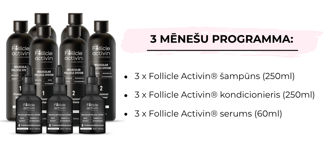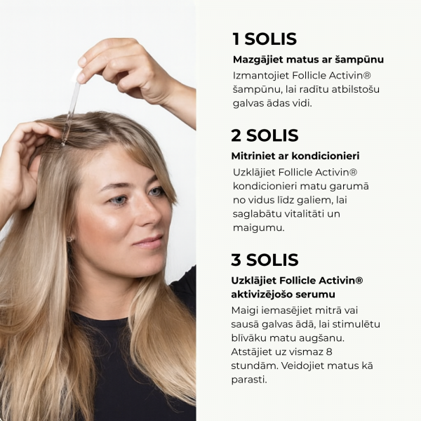 Follicle Activin šampūns (250 ml): Uzklājiet nelielu daudzumu šampūna uz samitrinātiem matiem, vienmērīgi izklājiet un maigi iemasējiet galvas ādā, līdz izveidojas putas. Rūpīgi izskalojiet ar ūdeni. Ja nepieciešams – atkārtojiet. Izvairieties no saskares ar acīm, bet, ja produkts tomēr nokļūst acīs – rūpīgi izskalojiet ar ūdeni.