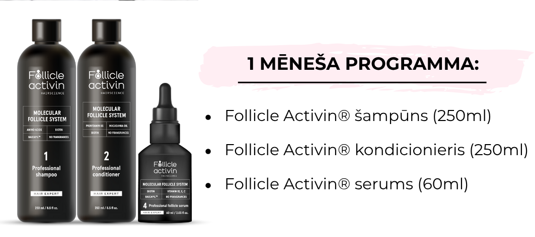 Follicle Activin līdzeklis (250 ml): Aqua, Cetearyl Alcohol, Behenamidopropyl Dimethylamine, Macadamia ternifolia seed oil, Lactic acid, Hydroge-nated ethylhexyl olivate, D-panthenol, Sodium benzoate, Benzyl alcohol, Glycolic acid, Potassium Sorbate, Hydrogenated olive oil unsaponifiables, Scutellaria baicalensis root extract, Biotin.